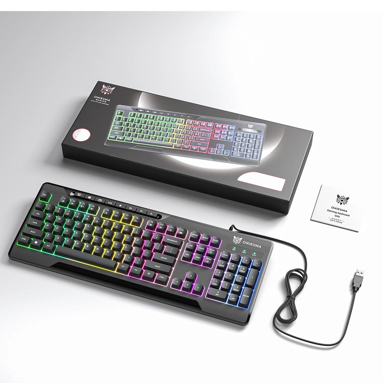 Onikuma G32 es un teclado para juegos con cable que ofrece retroiluminación RGB dinámica y un diseño ergonómico. Está disponible en versiones de membrana y mecánicas, con diferentes recuentos de teclas. Características clave Retroiluminación RGB: Cuenta con iluminación RGB dinámica que permite a los usuarios personalizar el aspecto de su configuración de juego. Diseño ergonómico: Proporciona un diseño ergonómico para una experiencia de juego cómoda. Teclas mate: Las teclas mate ofrecen un tacto y una estética mejorados. Conexión por cable: Se conecta a través de un cable USB, lo que garantiza una conexión estable y sin demoras. Material a prueba de salpicaduras: Según compramaspty.myshopify.com, el teclado tiene un diseño a prueba de salpicaduras.